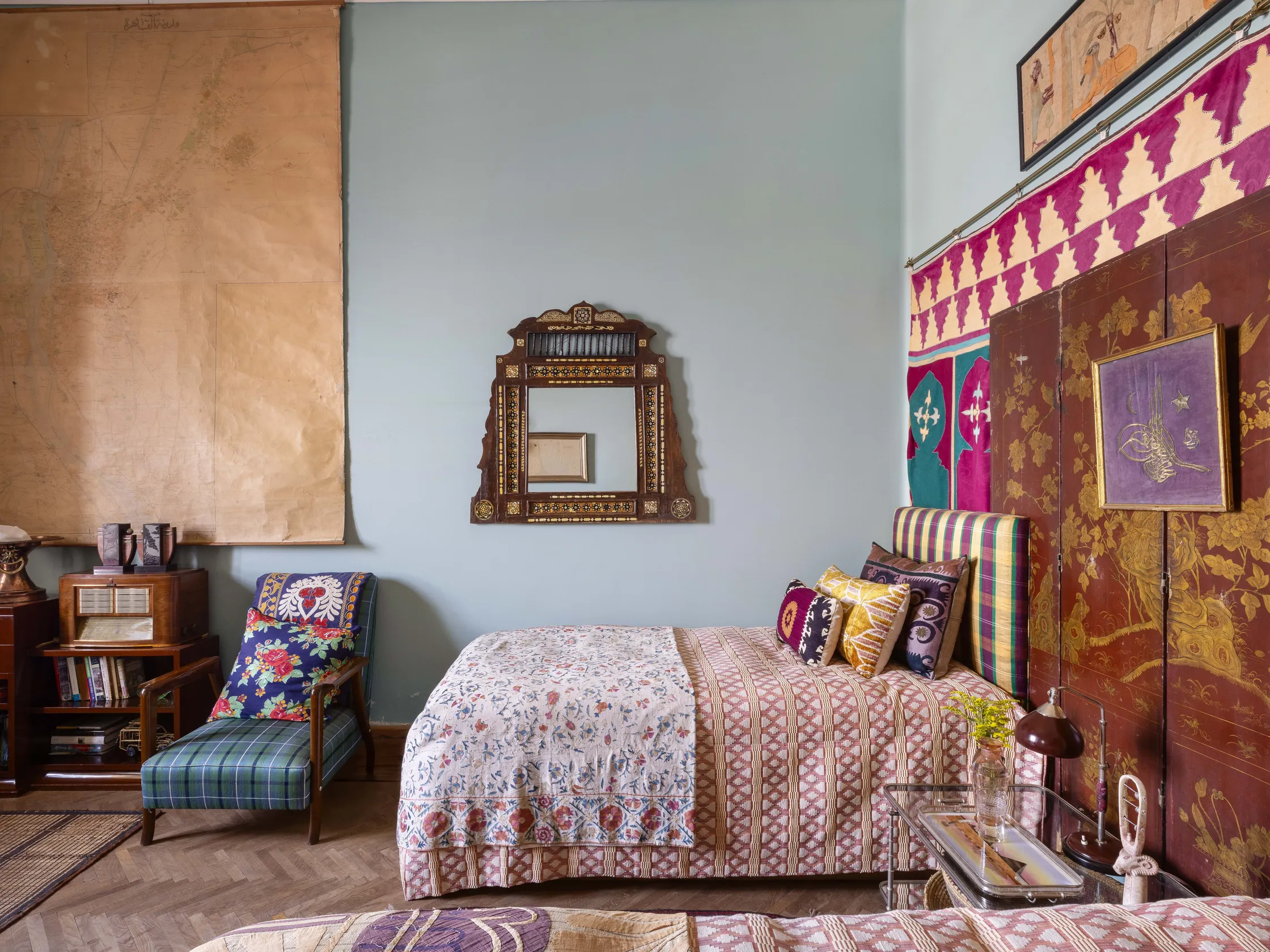 The fusion of a Chinese screen with Moroccan tent textiles behind guest beds exemplifies his eclectic style.