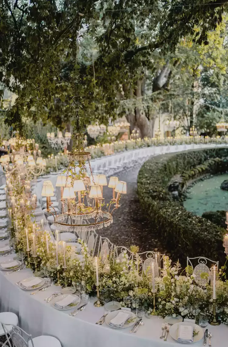 Craft a fairy tale come alive with tables draped in flowing chiffon. Cascading floral garlands and fairy lights enchant the night.
