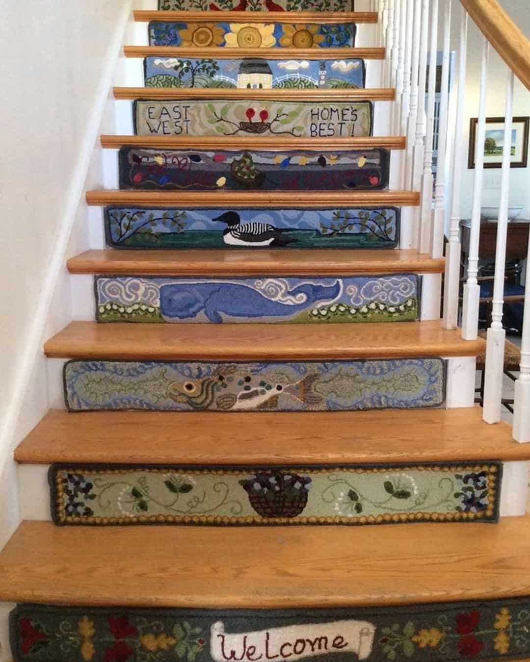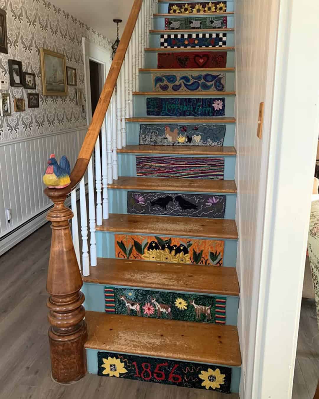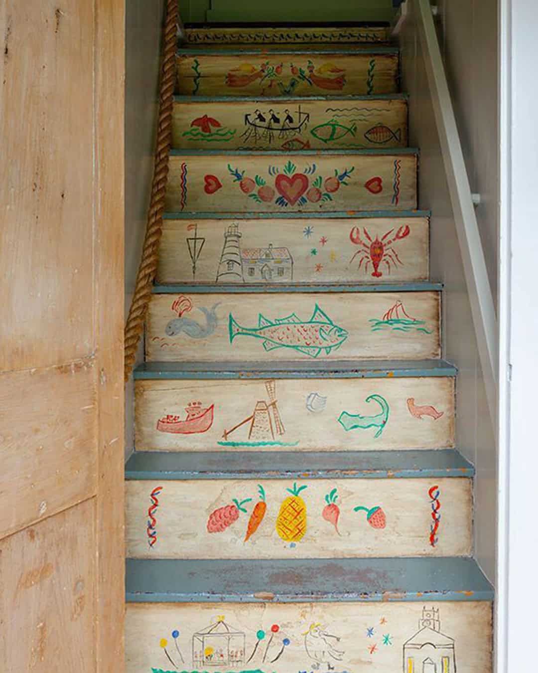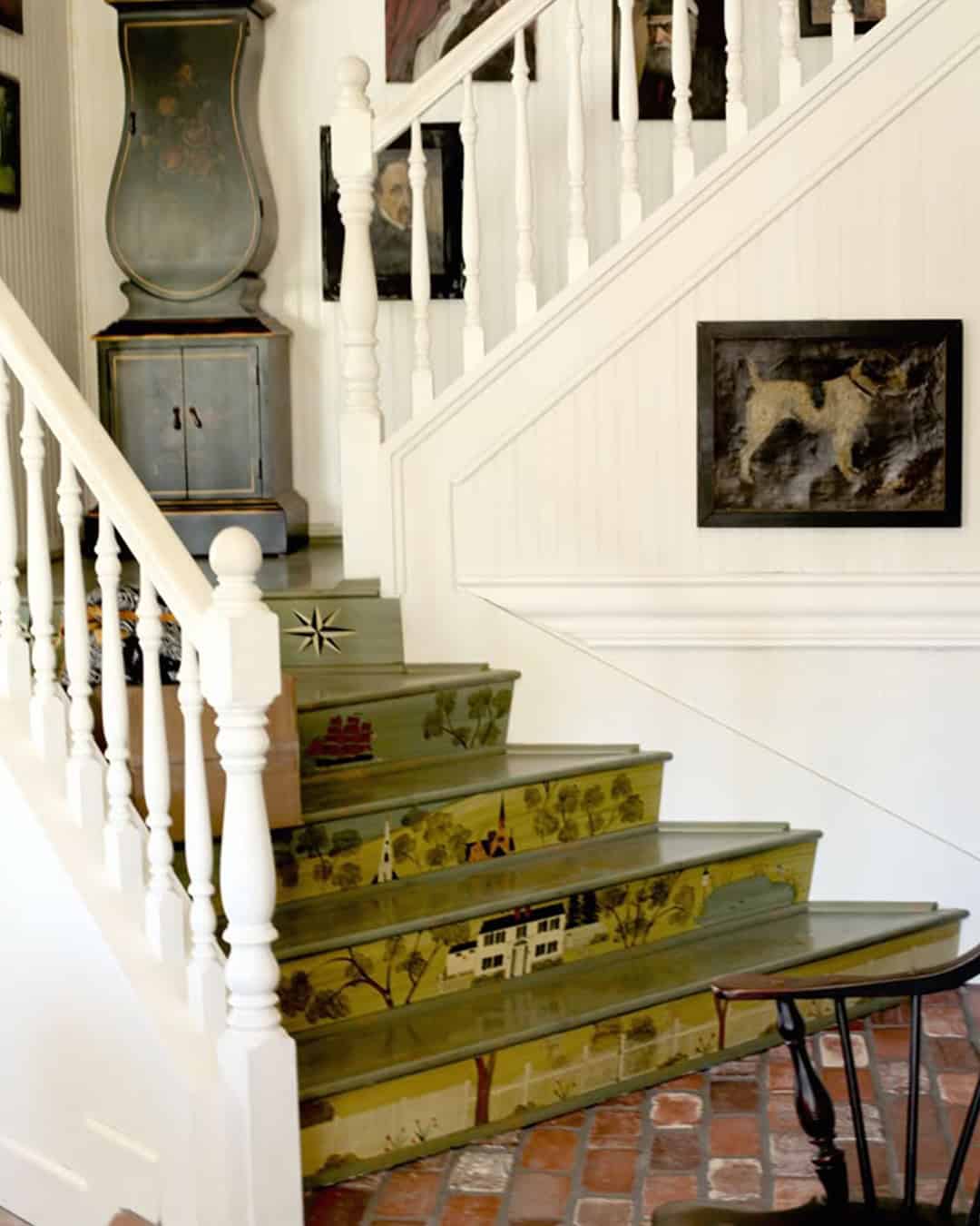 This folk art staircase is a nod to history, each step a page from the past.
