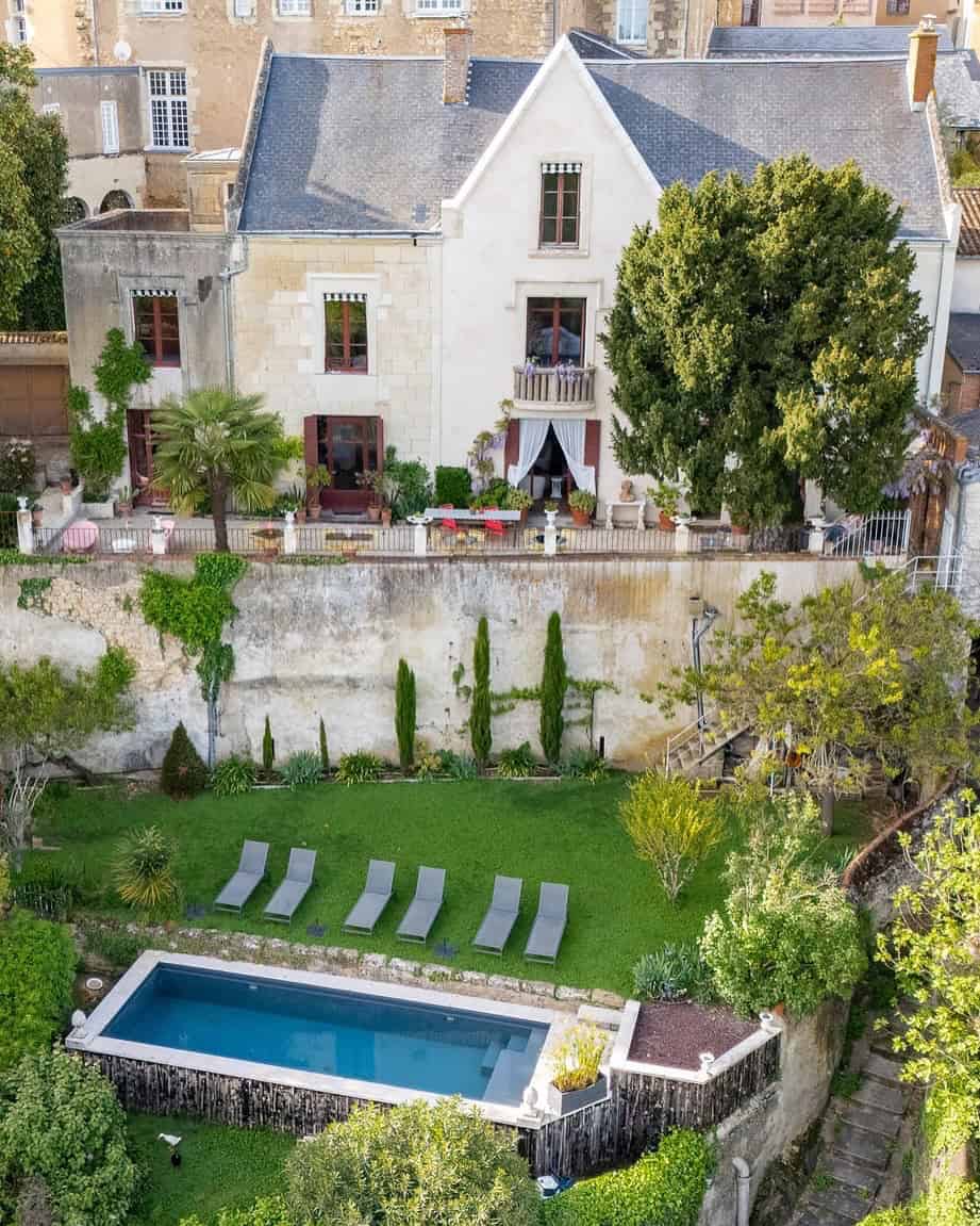 The pool and surrounding gardens are set at a lower level, offering a natural terrace feel. It’s an idyllic spot for relaxation, where nature and luxury seamlessly blend.